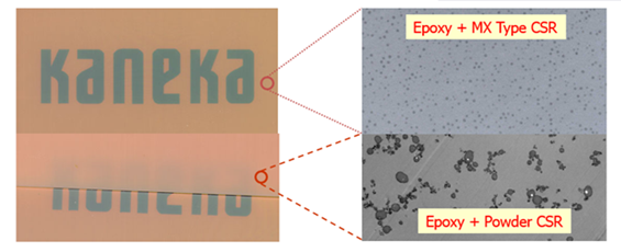 TEM analysis shows complete dispersion of CSR particles via MX while conventional tougheners suffer from agglomeration issues.